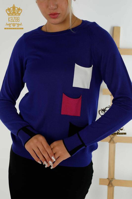 Wholesale Women's Knitwear Sweater Colorful Pocket Crew Neck Saks - 30108 | KAZEE