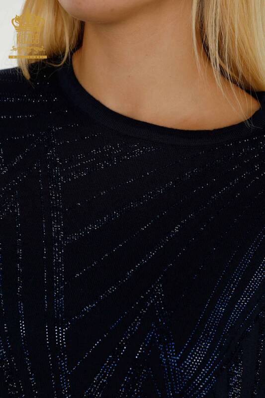 Wholesale Women's Knitwear Sweater Crew Neck Stone Embroidered Navy Blue - 30027 | KAZEE