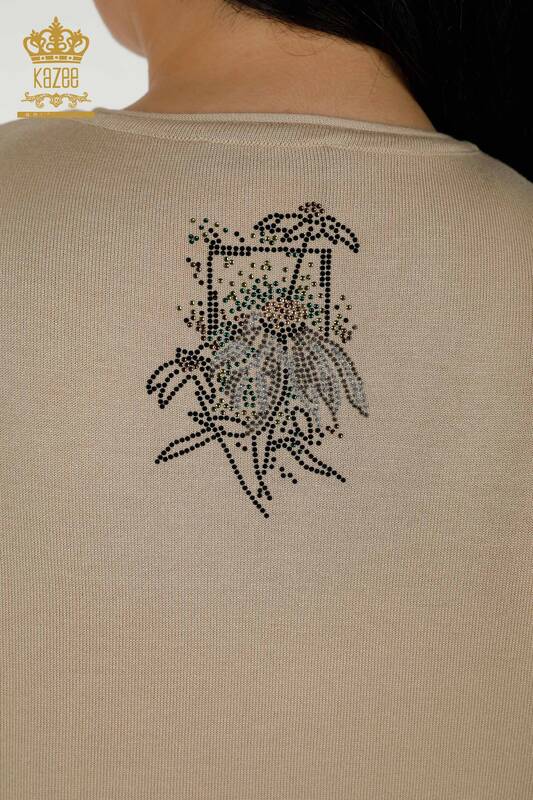 Wholesale Women's Knitwear Sweater Floral Patterned Short Sleeve Stone Embroidered Beige - 16963 | KAZEE