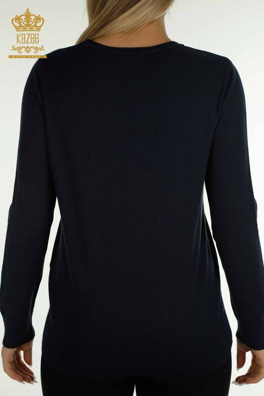 Wholesale Women's Knitwear Floral Patterned Stone Embroidered Long Sleeve Navy Blue - 16849 | KAZEE