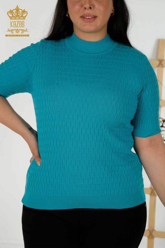 Wholesale Women's Knitwear Sweater Stand Up Collar Self Woven Turquoise - 30338 | KAZEE
