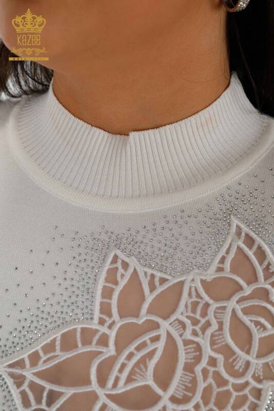 Wholesale Women's Knitwear Sweater Tulle Detailed Stone Embroidered Rose Patterned Ecru - 16832 | KAZEE