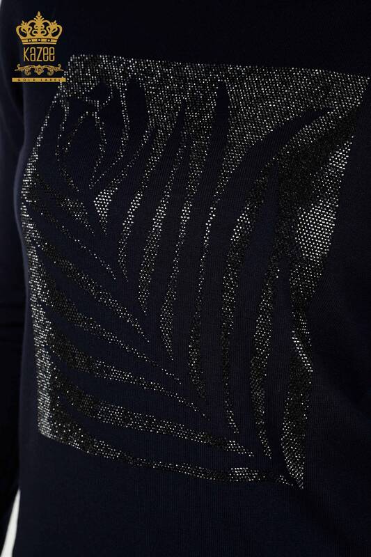 Wholesale Women's Knitwear Sweater Rose Patterned Stone Embroidered Navy Blue - 30448 | KAZEE