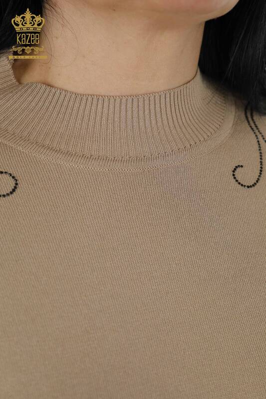 Wholesale Women's Knitwear Sweater Shoulder Flower Detailed Stone Embroidered Beige - 16597 | KAZEE