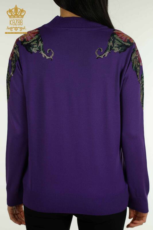 Wholesale Women's Knitwear Sweater Shoulder Flower Detailed Colored Stone Embroidered Purple - 30542 | KAZEE