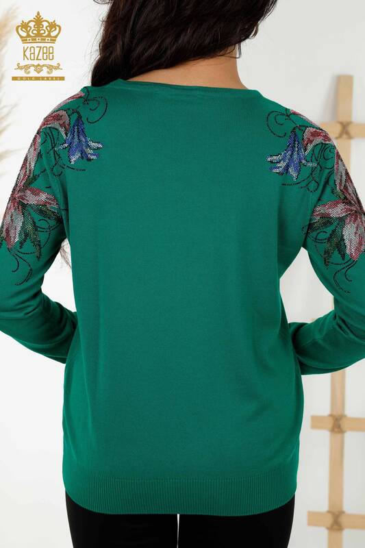 Wholesale Women's Knitwear Sweater Shoulder Flower Embroidered Stone Embroidered Green - 30188 | KAZEE