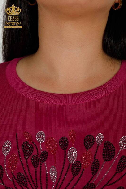 Wholesale Women's Knitwear Sweater Stone Embroidered Floral Patterned Fuchsia - 30156 | KAZEE