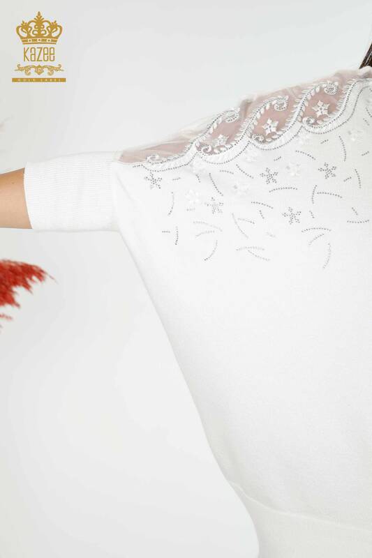 Wholesale Women's Knitwear Sweater Patterned Stone Embroidered Ecru - 16826 | KAZEE