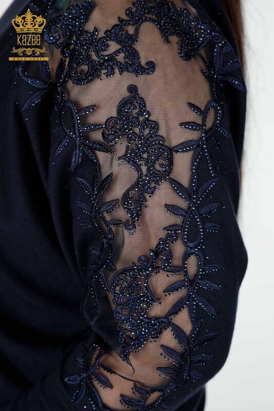 Wholesale Women's Knitwear Tulle Detailed Stone Embroidered Navy Blue - 15699 | KAZEE