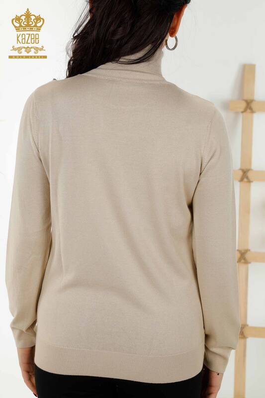 Wholesale Women's Knitwear Sweater Turtleneck Basic Logo Light Beige - 11122 | KAZEE