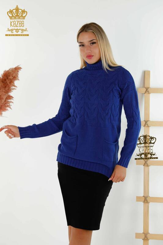 Wholesale Women's Knitwear Sweater Turtleneck Two Pockets Woven Saks - 30231 | KAZEE