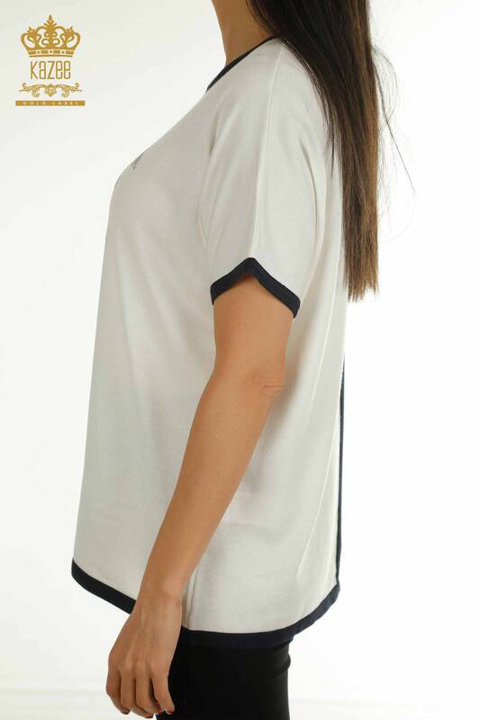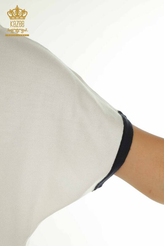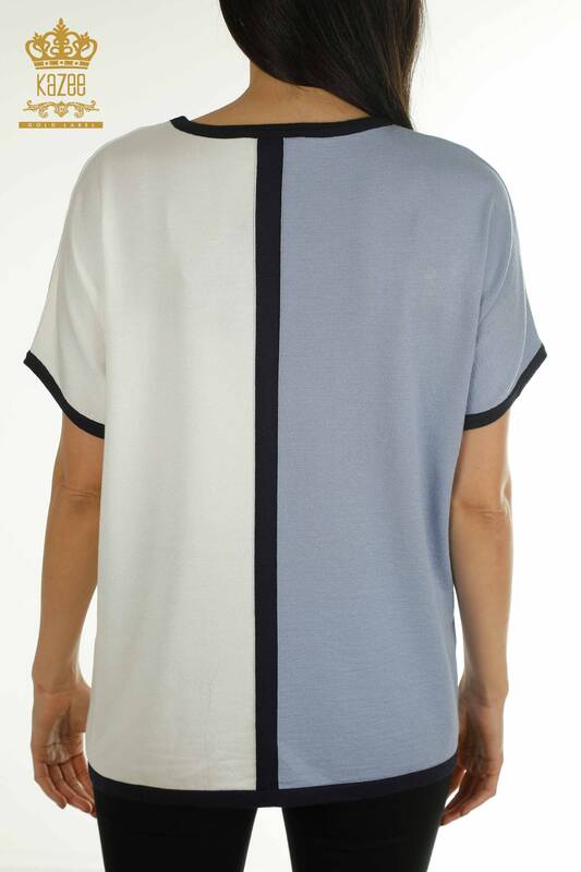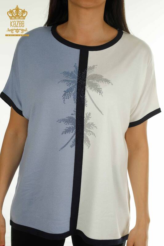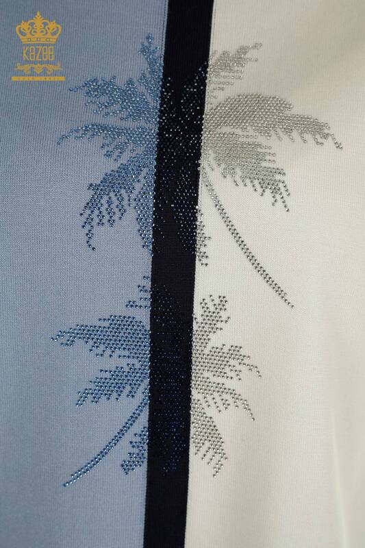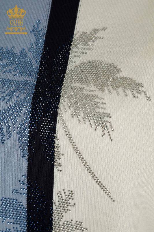 Wholesale Women's Knitwear Sweater Two Color Striped Stone Embroidered Blue - 30705 | KAZEE