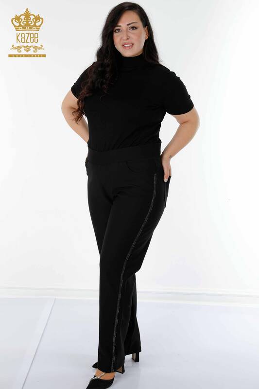 Wholesale Women's Leggings Trousers Stripe Stone Embroidered Black - 3664 | KAZEE
