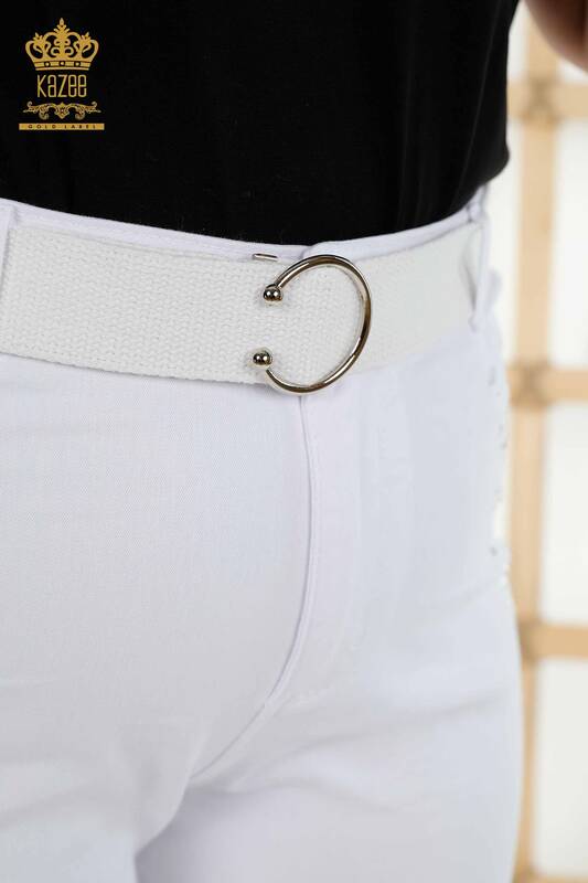 Wholesale Women's Trousers Belted Stone Embroidered Pocket Detailed White - 3689 | KAZEE