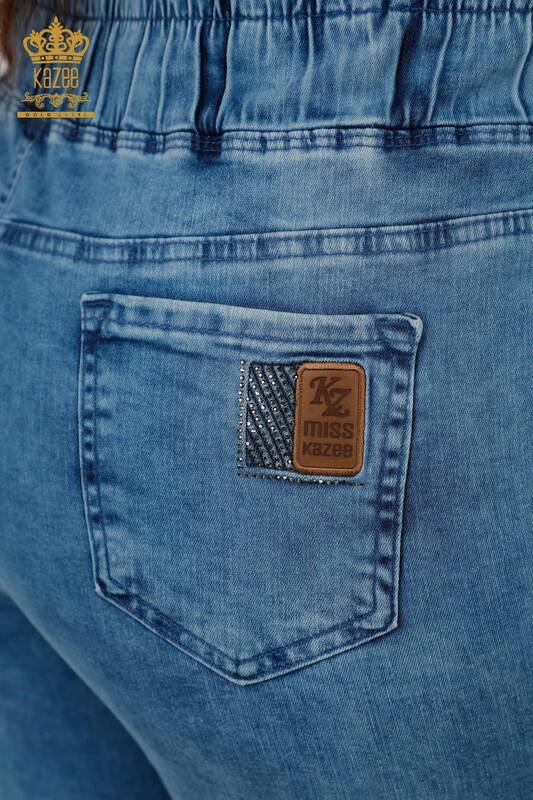 Wholesale Women's Trousers With Elastic Waist Stone Embroidered Pocket Blue - 3699 | KAZEE