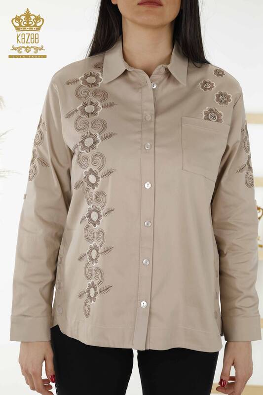 Wholesale Women's Shirt Flower Patterned Beige Embroidered Beige - 20246 | KAZEE