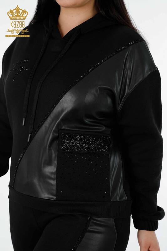 Wholesale Women's Tracksuit Set Leather Detailed Stone Embroidered Black - 17467 | KAZEE