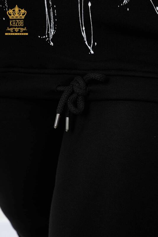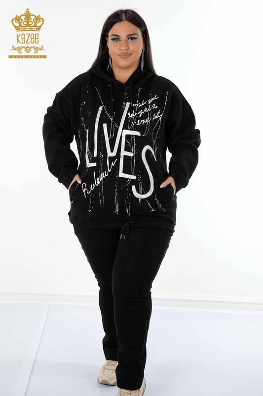 Wholesale Women's Tracksuit Set Hooded Printed Pocket Stone Embroidered Black - 17296 | KAZEE