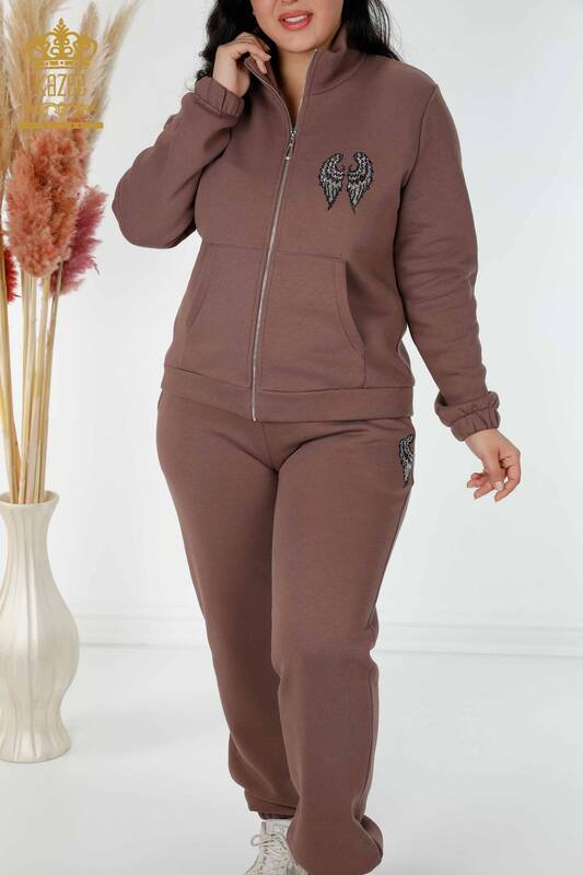 Wholesale Women's Tracksuit Set Angel Wing Pattern Crystal Stone Embroidered Brown - 17466 | KAZEE