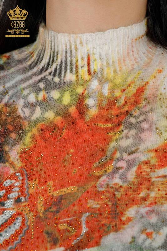 Wholesale Women's Sweater Stone Embroidered Angora Patterned Orange - 16002 | KAZEE