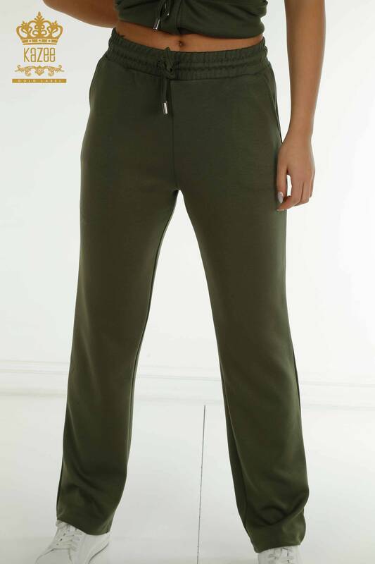 Wholesale Women's Triple Tracksuit Set Button Detailed Pocket Short Sleeve Khaki - 17633 | KAZEE