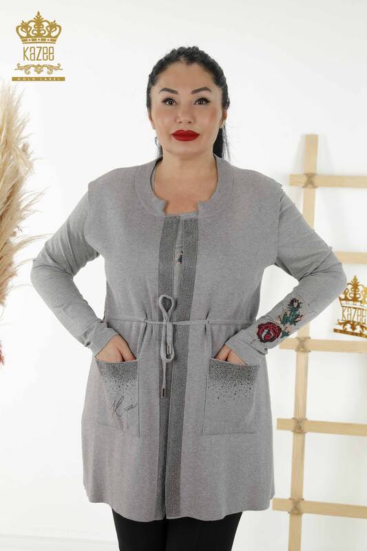 Wholesale Women's Vest With Crystal Stone Embroidered Pocket Rope Tie Gray - 30299 | KAZEE