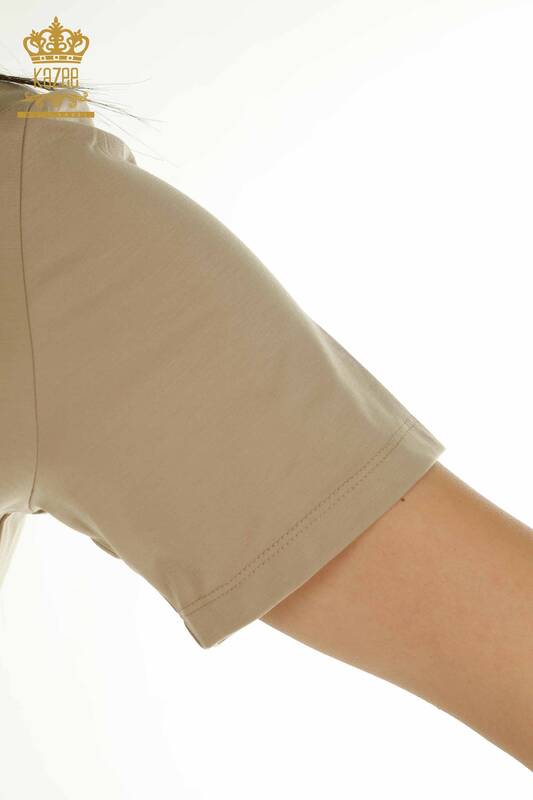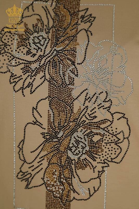 Wholesale Women's Blouse Stone Embroidered Floral Pattern Short Sleeve Dark Beige - 79502 | KAZEE