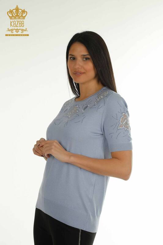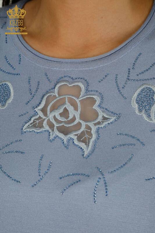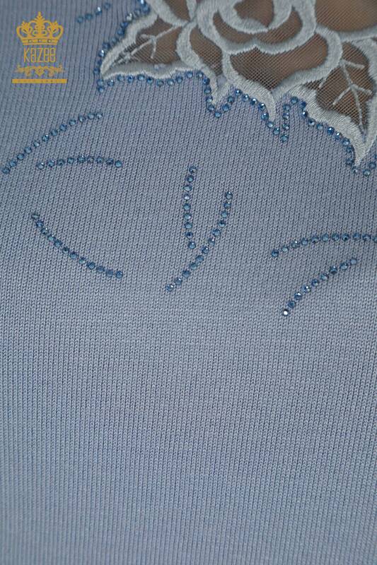 Wholesale Women's Knitwear Sweater American Model Stone Embroidered Tulle Detailed Blue - 31036 | KAZEE