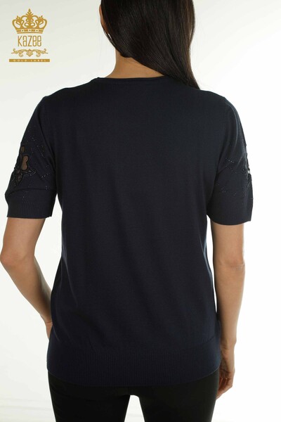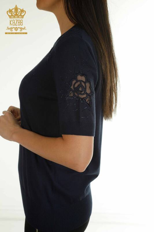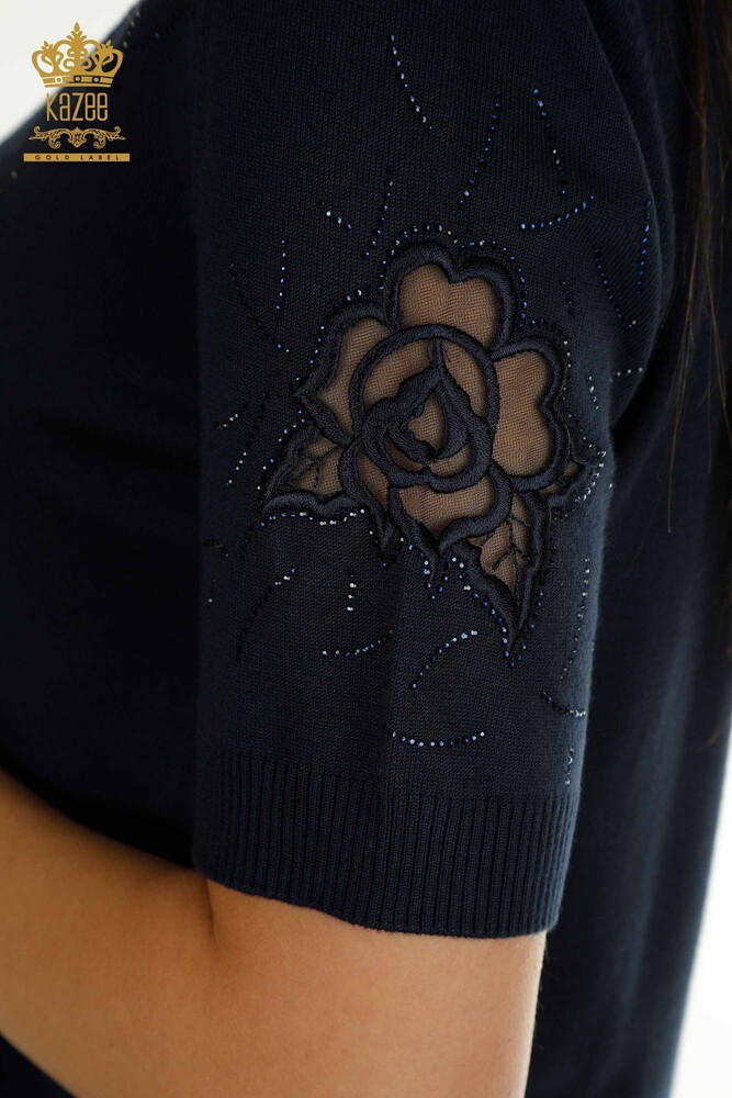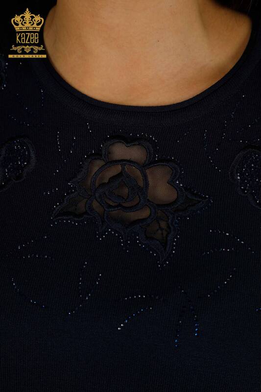 Wholesale Women's Knitwear Sweater American Model Stone Embroidered Tulle Detailed Navy Blue - 31036 | KAZEE