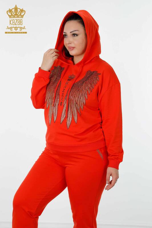 Wholesale Women's Tracksuit Set Angel Wing Pattern Stone Embroidered Orange - 17481 | KAZEE