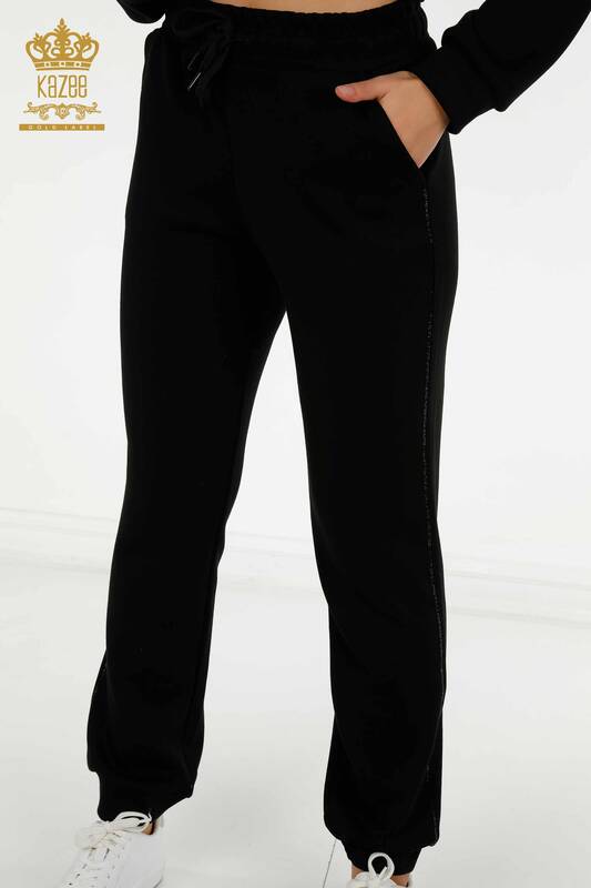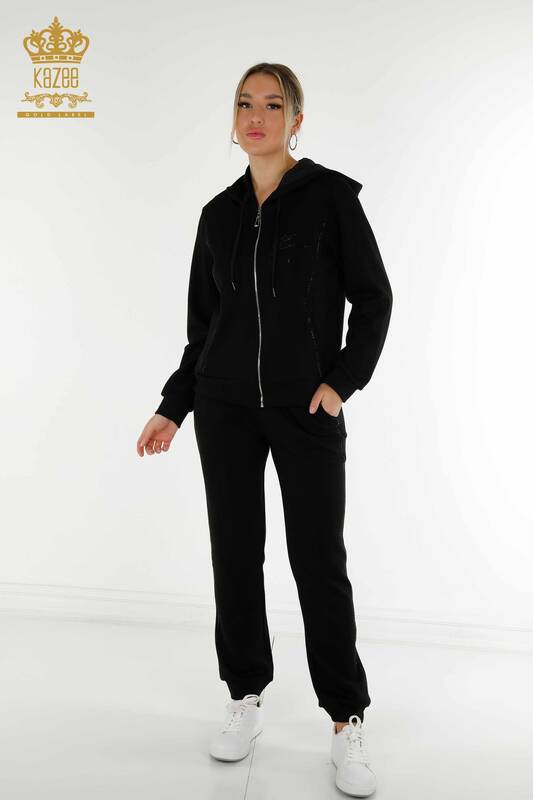 Wholesale Women's Tracksuit Set Black with Stone Embroidery Hooded Zipper - 20414 | KAZEE
