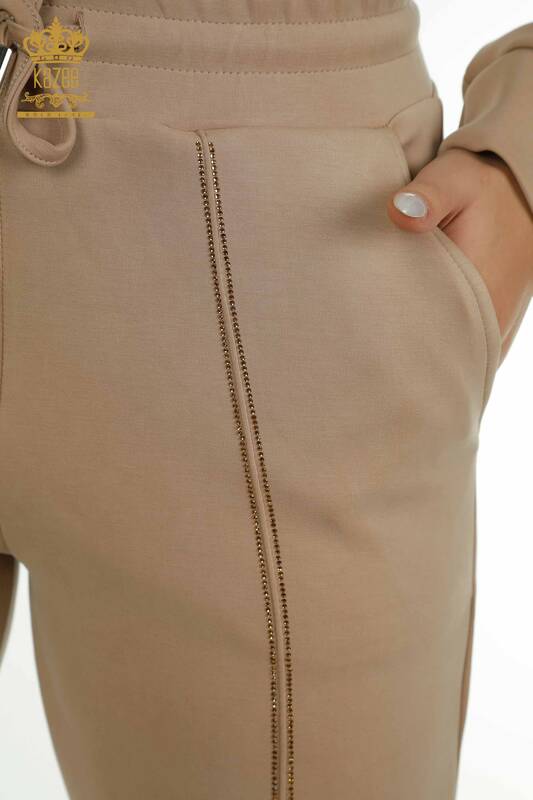 Wholesale Women's Tracksuit Set Hooded Zippered Stone Embroidered Beige - 17618 | KAZEE