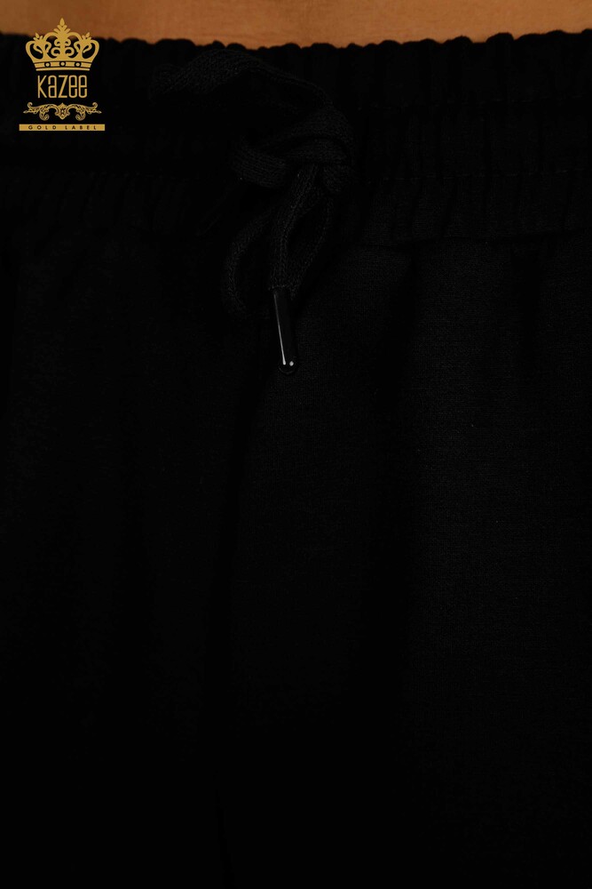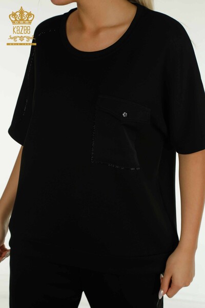 Wholesale Women's Tracksuit Set Short Sleeve Stone Embroidered Pocket Black - 17692 | KAZEE