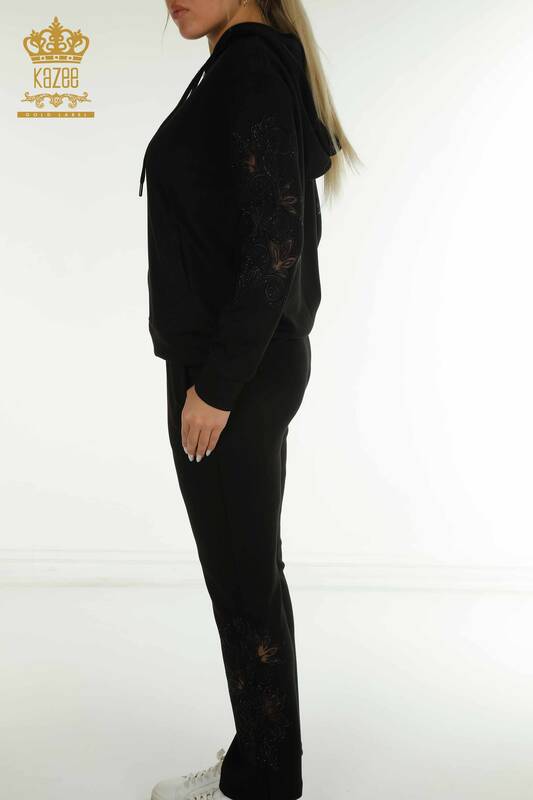 Wholesale Women's Tracksuit Set Zippered Stone Embroidered Hooded Sleeve Detailed Black - 17562 | KAZEE