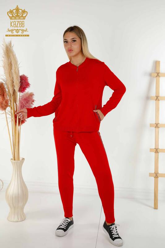 Wholesale Women's Tracksuit Set with Pocket Zipper and Stone Embroidery Red - 16679 | KAZEE