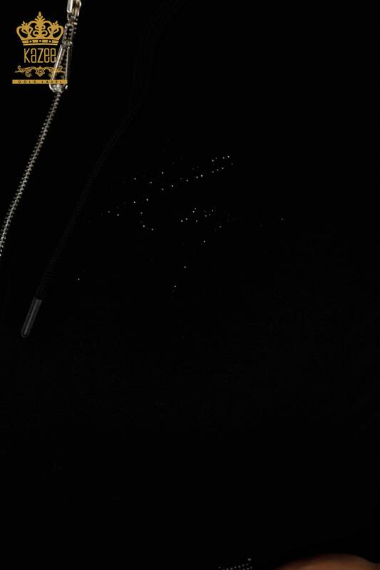 Wholesale Women's Tracksuit Set Hooded Stone Embroidered Pocket Black - 20392 | KAZEE