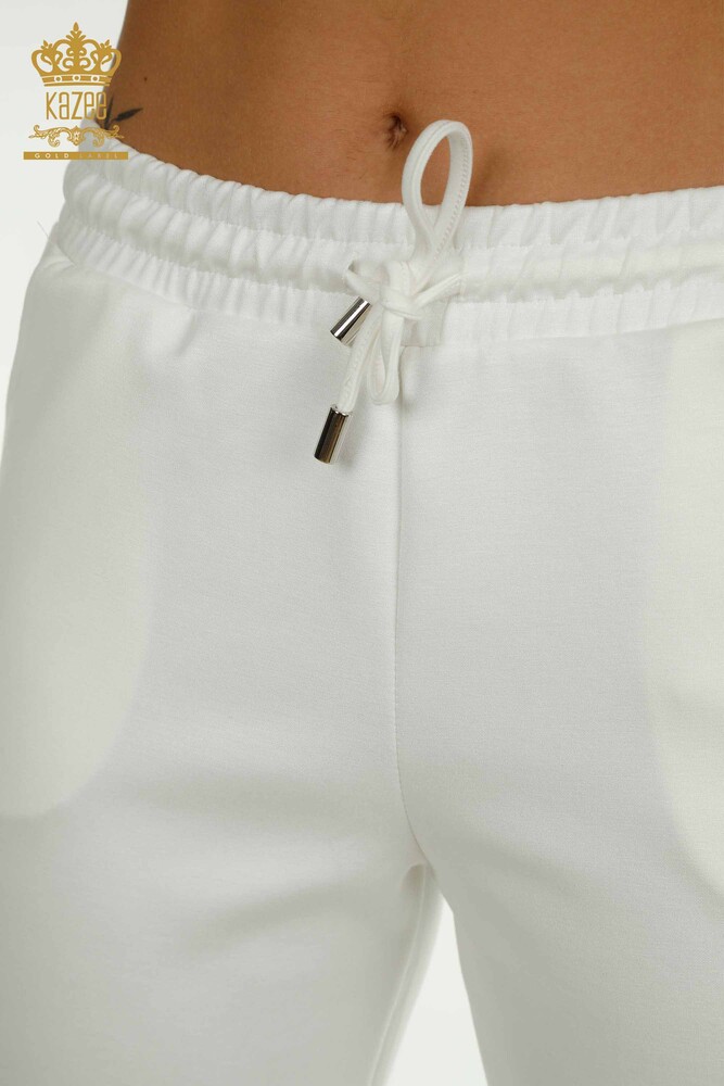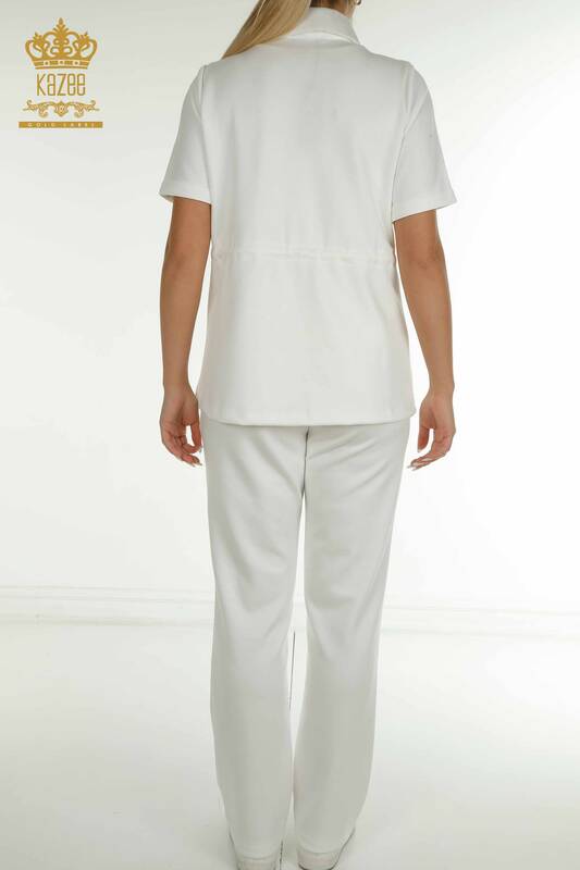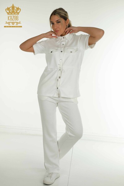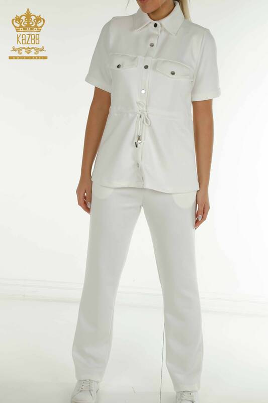 Wholesale Women's Triple Tracksuit Set Button Detailed Pocket Short Sleeve Ecru - 17633 | KAZEE