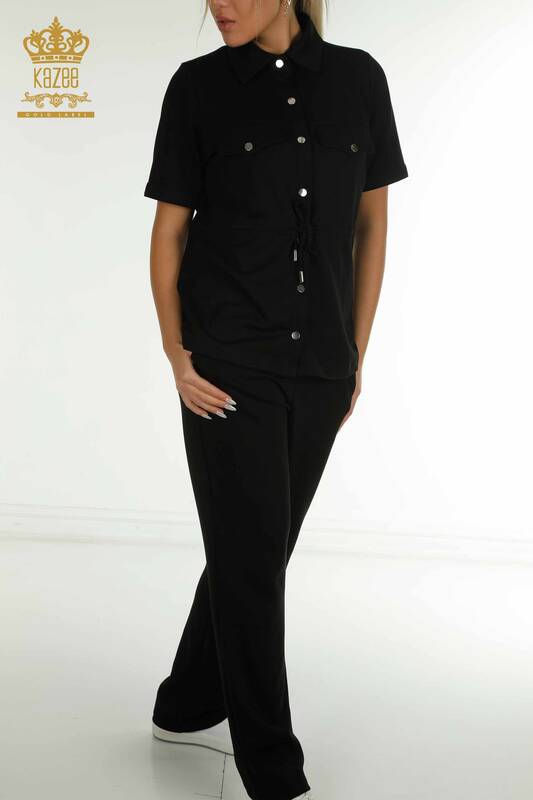 Wholesale Women's Triple Tracksuit Set Button Detailed Pocket Short Sleeve Black - 17633 | KAZEE