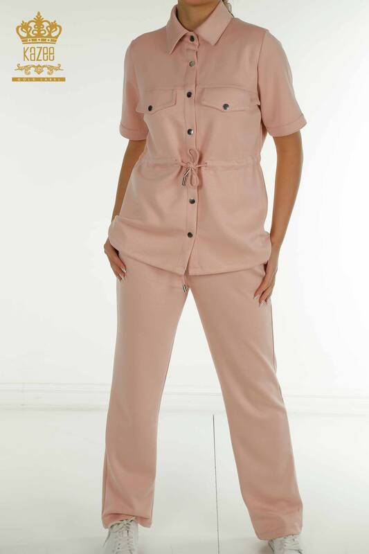 Wholesale Women's Triple Tracksuit Set Button Detailed Pocket Short Sleeve Powder - 17633 | KAZEE