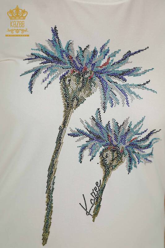 оптом женская блузка с цветочным узором, вышитая камнем, с коротким рукавом, экрю - 79369 | КАЗЕЕ