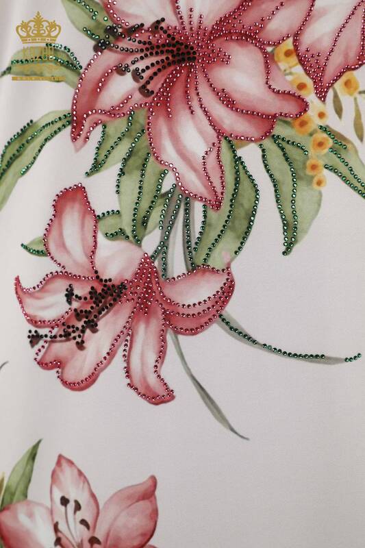 оптом Женская блузка с цветочным узором, вышитая камнем, с коротким рукавом, сиреневая - 77769 | КАЗЕЕ