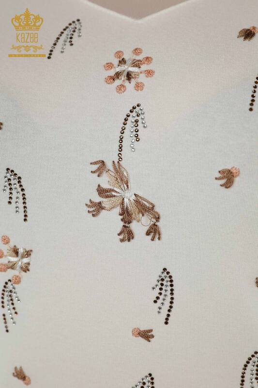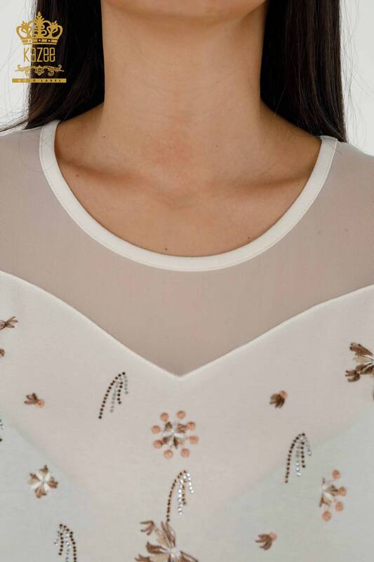 Оптовая Женская Блузка Тюль Подробный Цветочный Узор Вышитый Камнем Экрю - 79133 | КАЗЕЕ