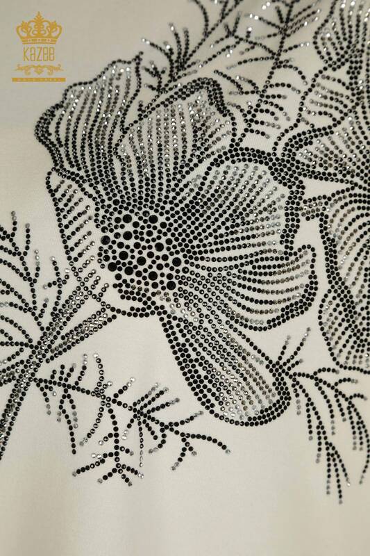 Оптовая продажа, Женская блузка с цветочным узором, вышитая камнем, тюль, подробная информация, Ecru - 79298 | KAZEE