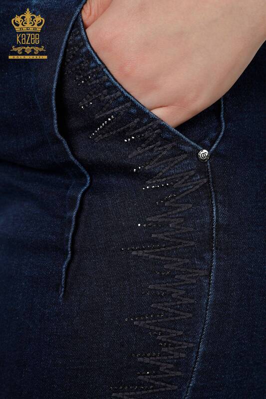 Оптовые Женские Брюки Эластичный Полосой Талии Камень Вышитый Карман Подробный Темно-Синий - 3654 | КАЗЕЕ