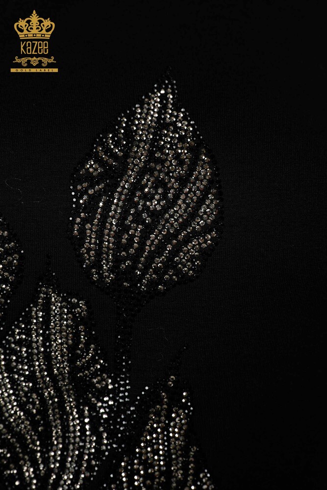 Оптовая Женская Блузка Камнем Вышитый Цветочный Узор Черный - 79041 | КАЗЕЕ