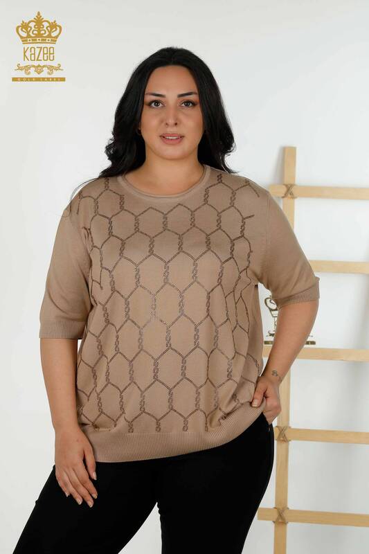 Оптовый Женский Трикотаж Свитер Вышитый Камнем Узорный Бежевый - 30317 | КАЗЕЕ