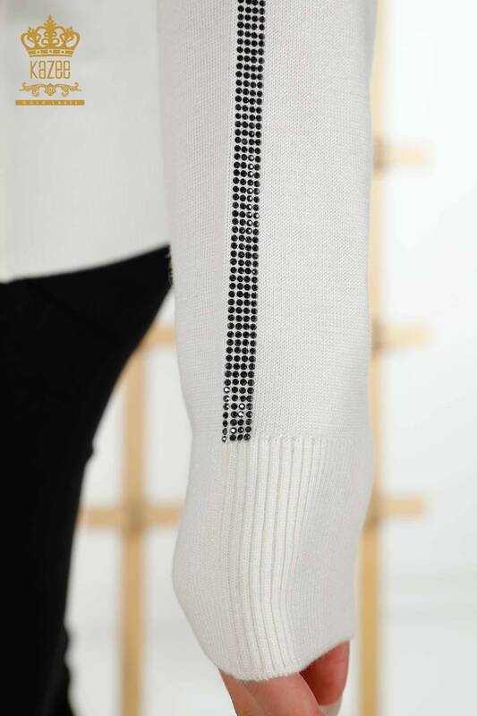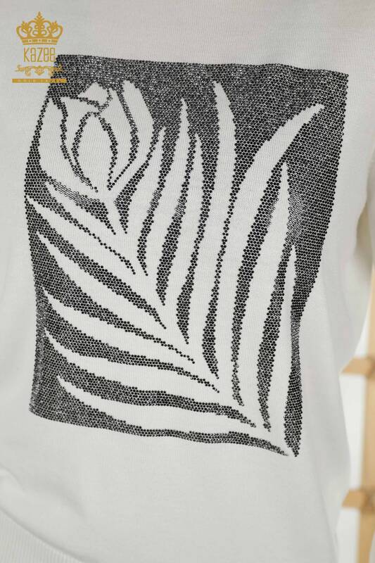Женский вязаный свитер оптом с розовым узором и вышивкой камнями, экрю - 30448 | КАЗИ