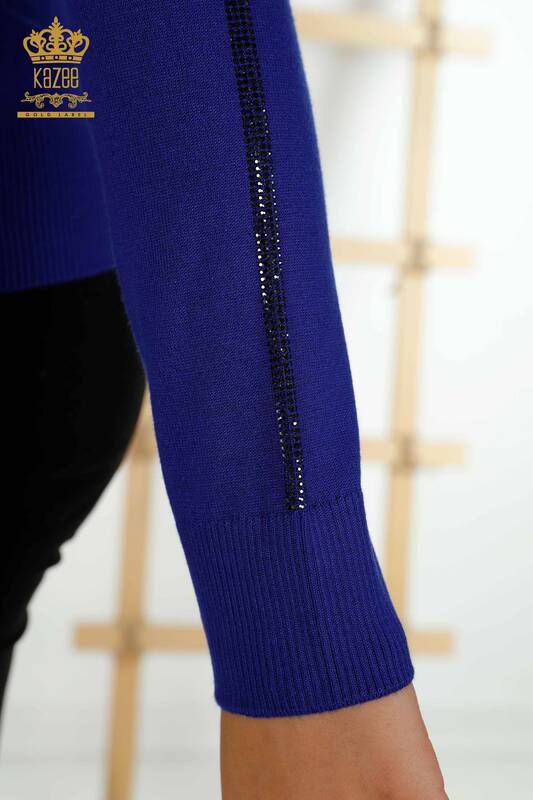 Оптовая продажа женского трикотажного свитера Сакс с розовым узором и каменной вышивкой - 30448 | КАЗИ
