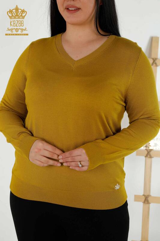 Женский трикотаж оптом Свитер с V-образным вырезом Basic Logo Горчичный - 30181 | КАЗЕЕ