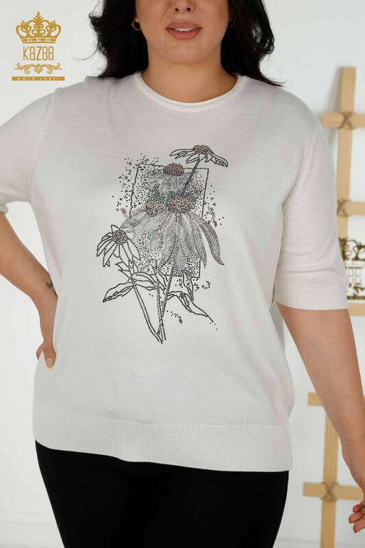оптом женский трикотаж свитер с цветочным узором с коротким рукавом вышитый камнем экрю - 16963 | КАЗЕЕ